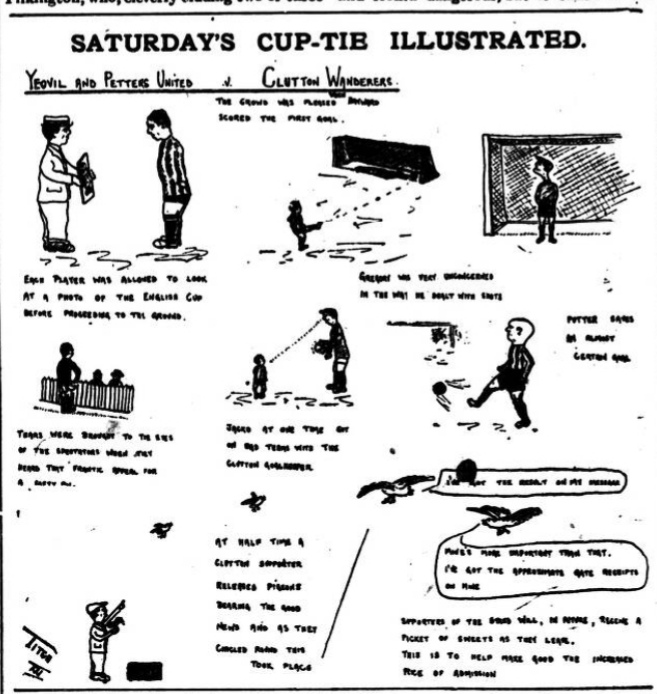 Clutton Wanderers,from a small village near Bath were the next opponents in the FA Cup. Again at Huish. The Wanderers turned up with two unusual things, firstly three siblings playing for them, the Magg brothers and secondly a basket of pidgeons to let off to half and full time to let the villagers know the score. Yeovil soon found out that small village or not, Clutton were a strong well organised side, which reflected with them laying top of the Somerset Senior League. However by half time, Webb and Hayward (His 13th goal of the month) had scored and that's how it stayed until the end, one can only joke the pidgeons got home safely with the score. The local media has a novel illustrated approach in reporting the match.
