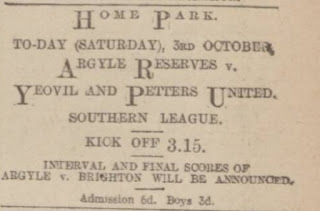 Five days later, Yeovil played their third away match in a week. This time a trip to Weymouth, where the local rivalry between the two clubs, a rivalry that still last today, was starting to take shape. The Glovers's fans were well represented at the Rec, Weymouth's old ground. It was an end to end game that finally saw Johnny Hayward win it for Yeovil 4-3. Unfortunately the excitement was too much for one Weymouth fan, a war pensioner, who fell over the ropes and died of a heart attack on the ground, despite the best efforts to revive him by the Cosham Fire Brigade who were on holiday and decided to take in the match.
